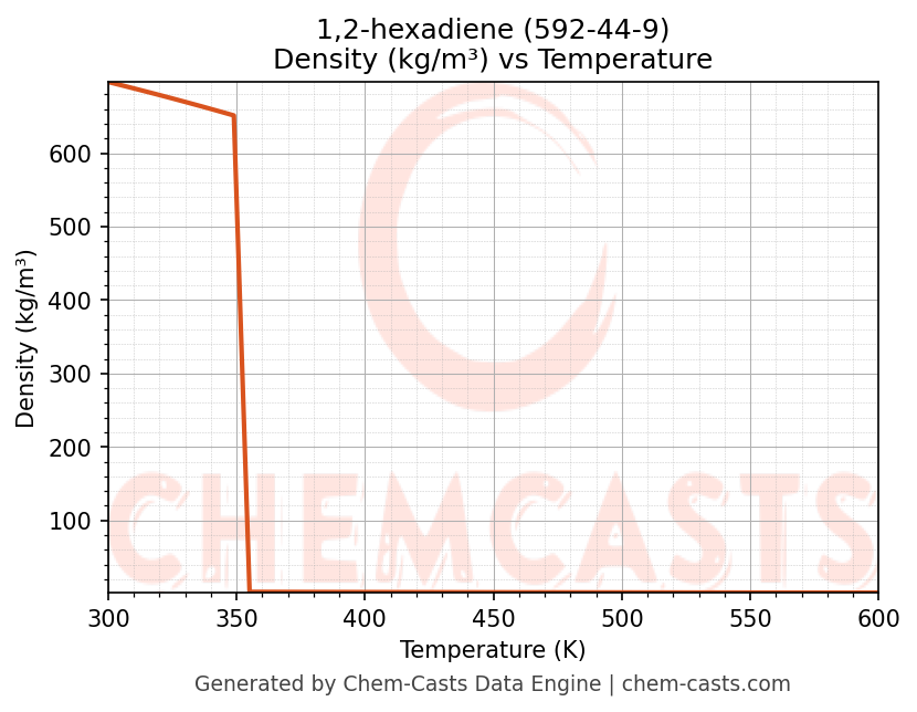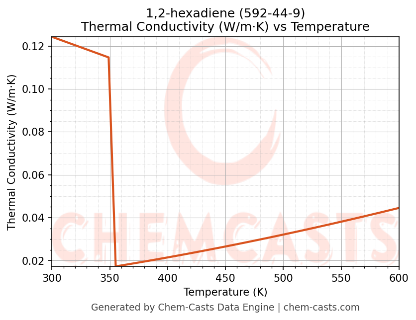 This page presents the temperature-dependent thermodynamic and transport properties of 1,2-hexadiene (CAS 592-44-9) calculated at a constant pressure of 1 atm (101325 Pa) over the temperature range 250-500 K.