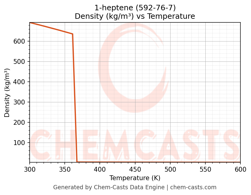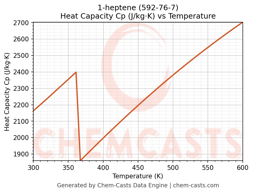 - Specific heat capacity (Cp) indicates the amount of energy required to raise the temperature of 1-heptene and is critical for energy balance and heat-exchanger design.