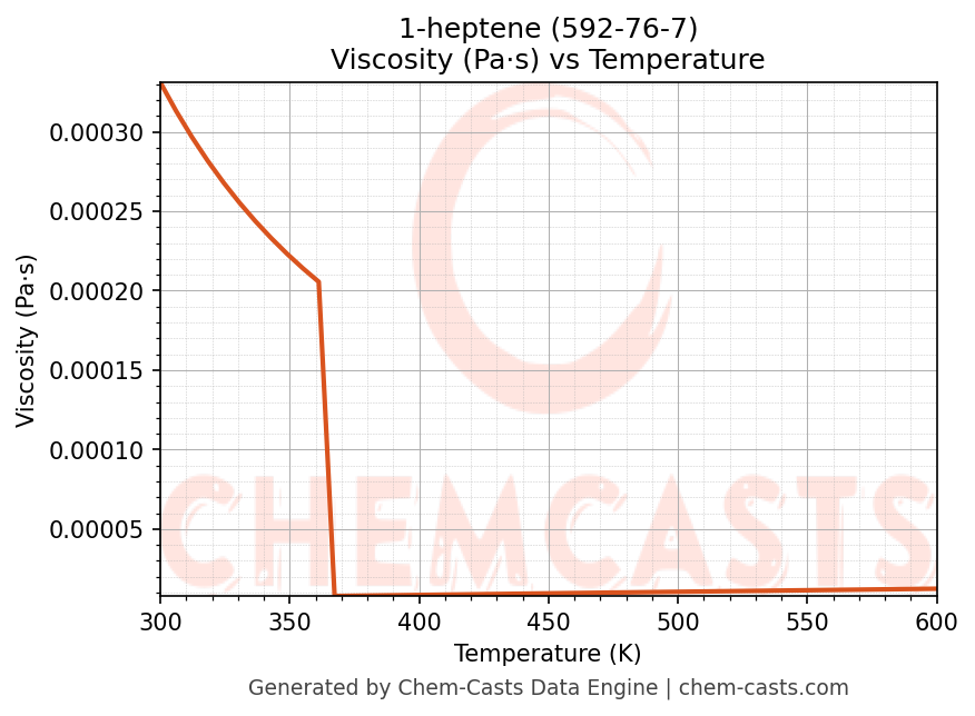 This page presents the temperature-dependent thermodynamic and transport properties of 1-heptene (CAS 592-76-7) calculated at a constant pressure of 1 atm (101325 Pa) over the temperature range 250-500 K.