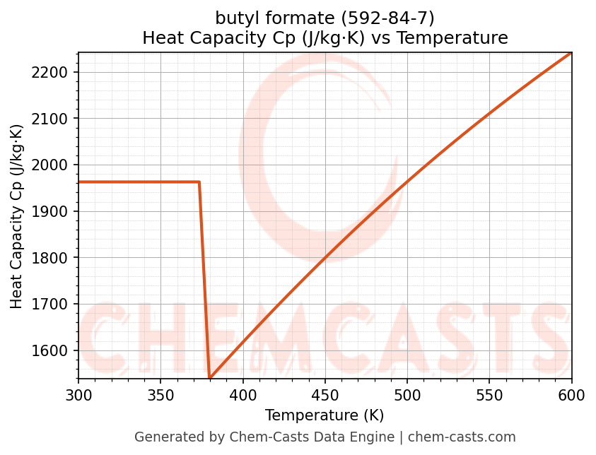 - Specific heat capacity (Cp) indicates the amount of energy required to raise the temperature of butyl formate and is critical for energy balance and heat-exchanger design.