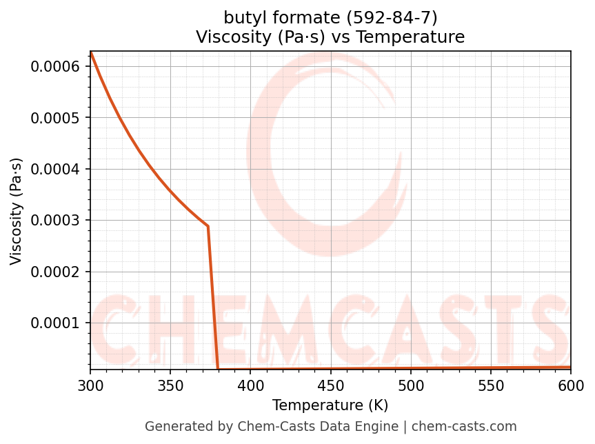 This page presents the temperature-dependent thermodynamic and transport properties of butyl formate (CAS 592-84-7) calculated at a constant pressure of 1 atm (101325 Pa) over the temperature range 250-500 K.