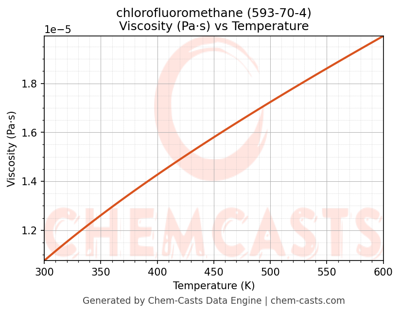 This page presents the temperature-dependent thermodynamic and transport properties of chlorofluoromethane (CAS 593-70-4) calculated at a constant pressure of 1 atm (101325 Pa) over the temperature range 250-500 K.