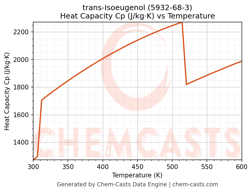 - Specific heat capacity (Cp) indicates the amount of energy required to raise the temperature of trans-Isoeugenol and is critical for energy balance and heat-exchanger design.