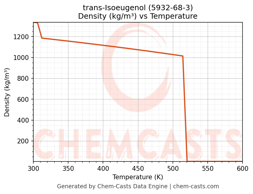 This page presents the temperature-dependent thermodynamic and transport properties of trans-Isoeugenol (CAS 5932-68-3) calculated at a constant pressure of 1 atm (101325 Pa) over the temperature range 250-500 K.