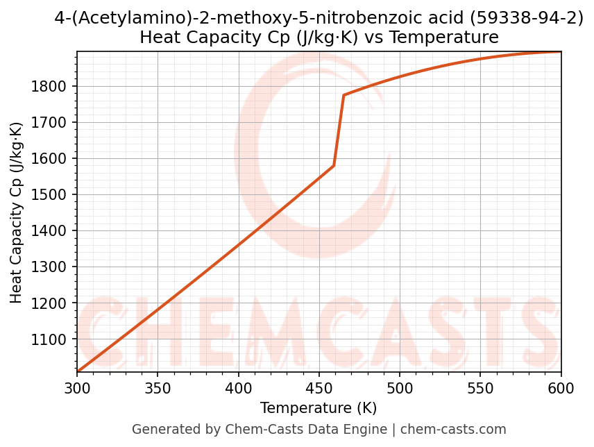 - Specific heat capacity (Cp) indicates the amount of energy required to raise the temperature of 4-(Acetylamino)-2-methoxy-5-nitrobenzoic acid and is critical for energy balance and heat-exchanger design.