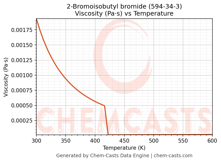This page presents the temperature-dependent thermodynamic and transport properties of 2-Bromoisobutyl bromide (CAS 594-34-3) calculated at a constant pressure of 1 atm (101325 Pa) over the temperature range 250-500 K.