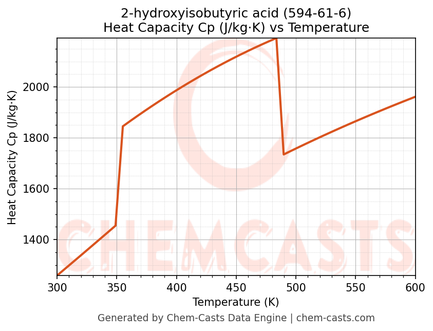 - Specific heat capacity (Cp) indicates the amount of energy required to raise the temperature of 2-hydroxyisobutyric acid and is critical for energy balance and heat-exchanger design.