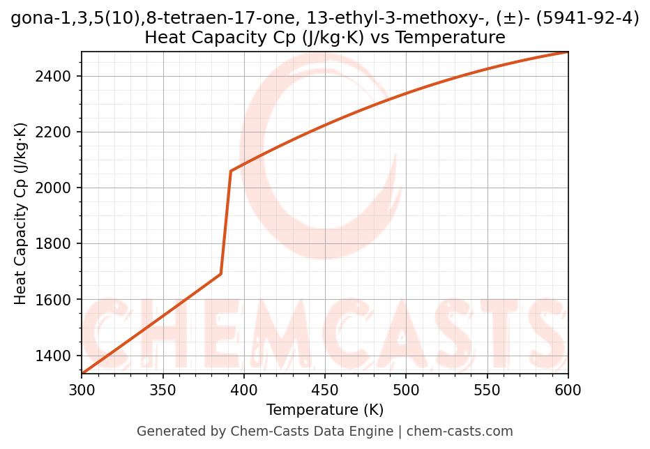 - Specific heat capacity (Cp) indicates the amount of energy required to raise the temperature of gona-1,3,5(10),8-tetraen-17-one, 13-ethyl-3-methoxy-, (±)- and is critical for energy balance and heat-exchanger design.