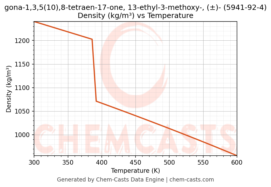 This page presents the temperature-dependent thermodynamic and transport properties of gona-1,3,5(10),8-tetraen-17-one, 13-ethyl-3-methoxy-, (±)- (CAS 5941-92-4) calculated at a constant pressure of 1 atm (101325 Pa) over the temperature range 250-500 K.
