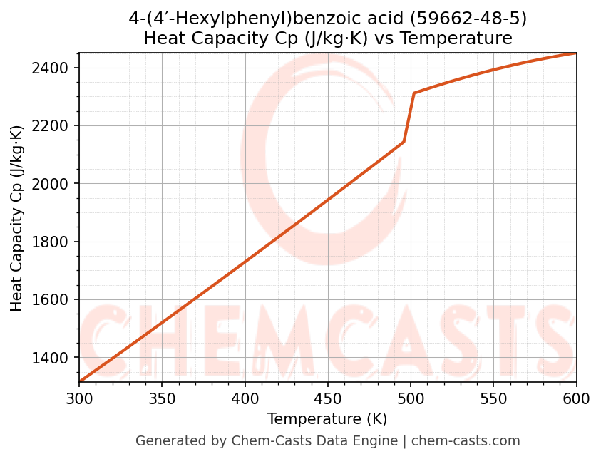 - Specific heat capacity (Cp) indicates the amount of energy required to raise the temperature of 4-(4′-Hexylphenyl)benzoic acid and is critical for energy balance and heat-exchanger design.