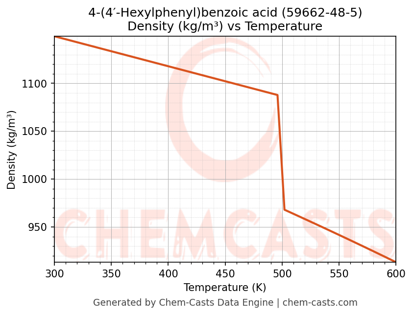 This page presents the temperature-dependent thermodynamic and transport properties of 4-(4′-Hexylphenyl)benzoic acid (CAS 59662-48-5) calculated at a constant pressure of 1 atm (101325 Pa) over the temperature range 250-500 K.