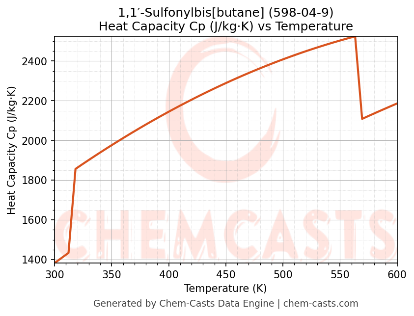 ![Heat Capacity (Cp) vs Temperature chart for 1,1′-Sulfonylbis[butane] (CAS 598-04-9)](https://chemcasts-prod.s3.ap-south-1.amazonaws.com/chem_plots_pconst/598-04-9-cp.png)