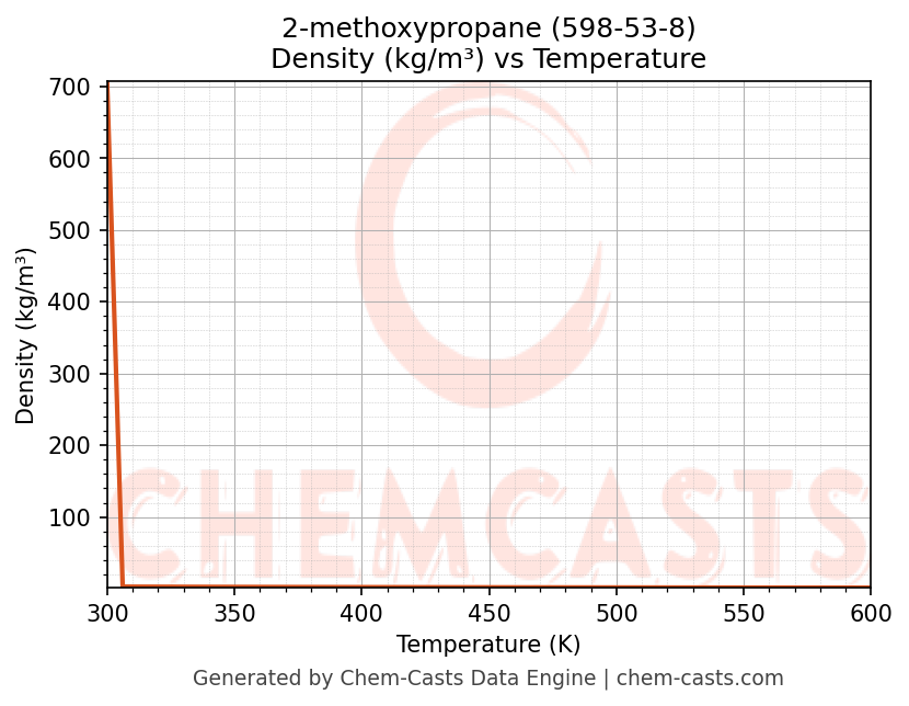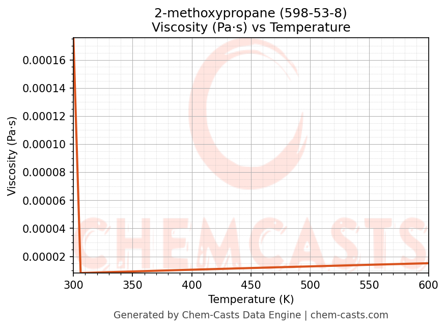 This page presents the temperature-dependent thermodynamic and transport properties of 2-methoxypropane (CAS 598-53-8) calculated at a constant pressure of 1 atm (101325 Pa) over the temperature range 250-500 K.