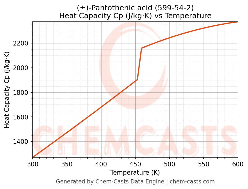 - Specific heat capacity (Cp) indicates the amount of energy required to raise the temperature of (±)-Pantothenic acid and is critical for energy balance and heat-exchanger design.