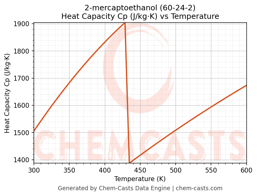 - Specific heat capacity (Cp) indicates the amount of energy required to raise the temperature of 2-mercaptoethanol and is critical for energy balance and heat-exchanger design.