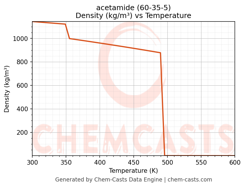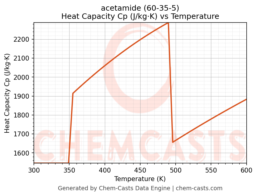- Specific heat capacity (Cp) indicates the amount of energy required to raise the temperature of acetamide and is critical for energy balance and heat-exchanger design.