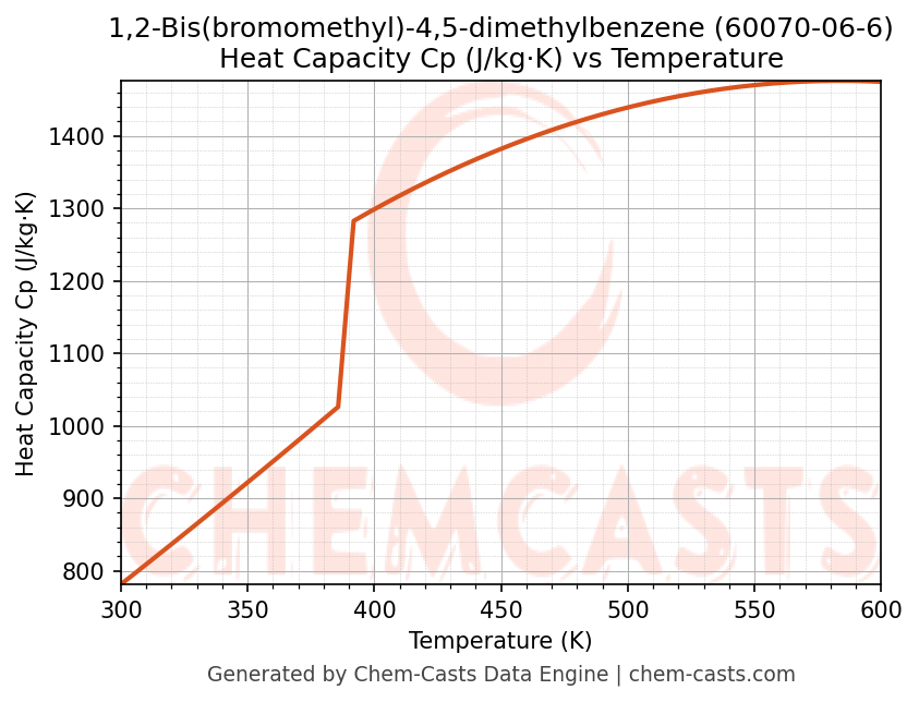 - Specific heat capacity (Cp) indicates the amount of energy required to raise the temperature of 1,2-Bis(bromomethyl)-4,5-dimethylbenzene and is critical for energy balance and heat-exchanger design.