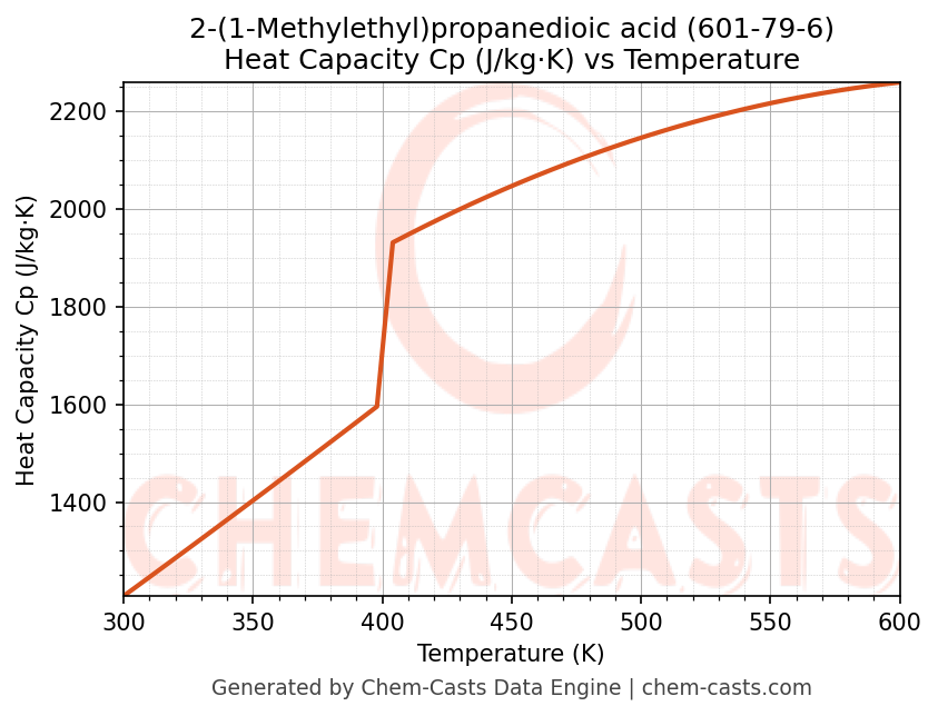 - Specific heat capacity (Cp) indicates the amount of energy required to raise the temperature of 2-(1-Methylethyl)propanedioic acid and is critical for energy balance and heat-exchanger design.
