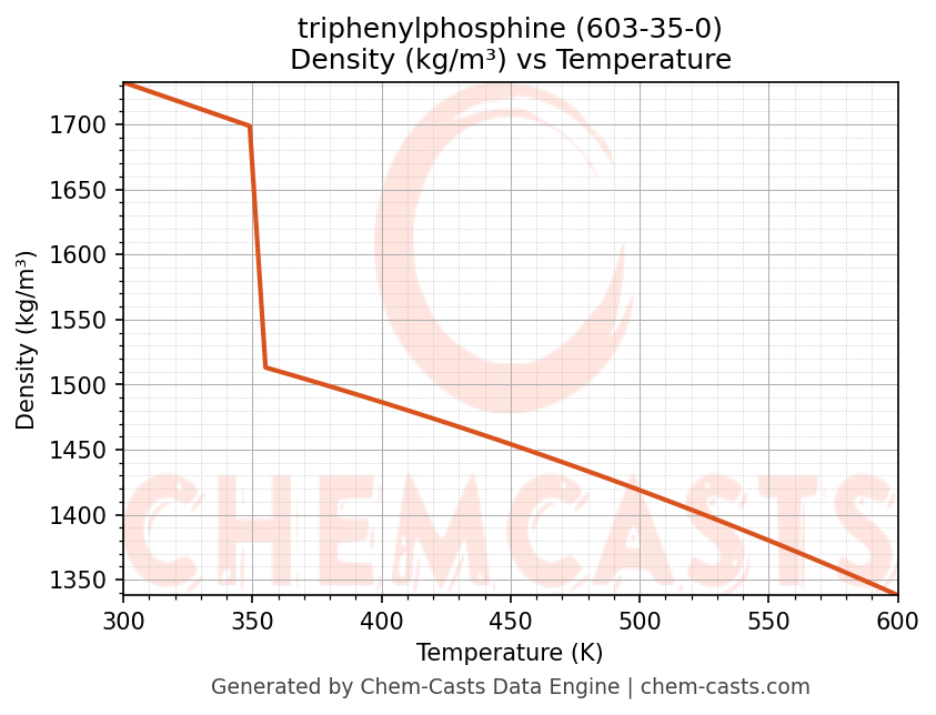 This page presents the temperature-dependent thermodynamic and transport properties of triphenylphosphine (CAS 603-35-0) calculated at a constant pressure of 1 atm (101325 Pa) over the temperature range 250-500 K.