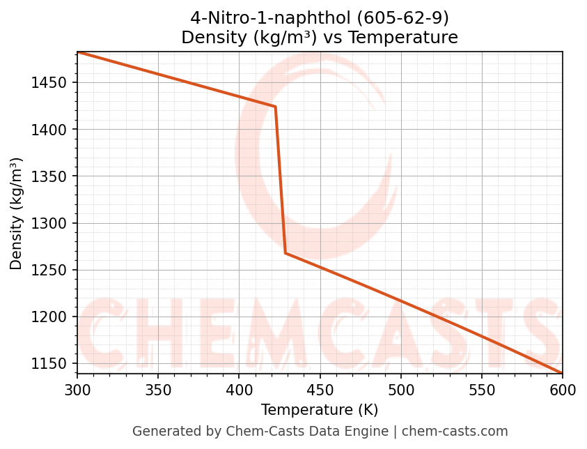 This page presents the temperature-dependent thermodynamic and transport properties of 4-Nitro-1-naphthol (CAS 605-62-9) calculated at a constant pressure of 1 atm (101325 Pa) over the temperature range 250-500 K.