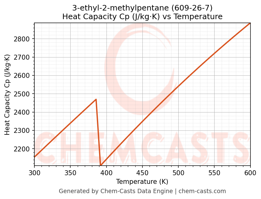 - Specific heat capacity (Cp) indicates the amount of energy required to raise the temperature of 3-ethyl-2-methylpentane and is critical for energy balance and heat-exchanger design.