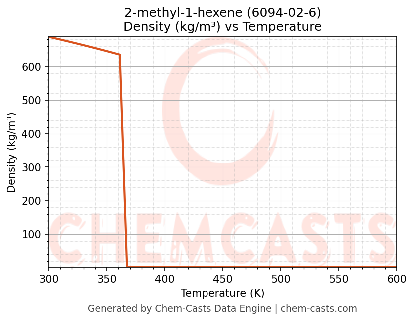 This page presents the temperature-dependent thermodynamic and transport properties of 2-methyl-1-hexene (CAS 6094-02-6) calculated at a constant pressure of 1 atm (101325 Pa) over the temperature range 250-500 K.