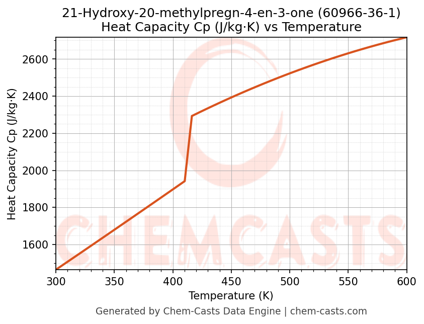 - Specific heat capacity (Cp) indicates the amount of energy required to raise the temperature of 21-Hydroxy-20-methylpregn-4-en-3-one and is critical for energy balance and heat-exchanger design.