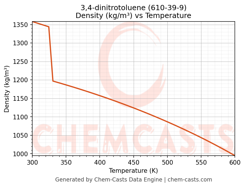 This page presents the temperature-dependent thermodynamic and transport properties of 3,4-dinitrotoluene (CAS 610-39-9) calculated at a constant pressure of 1 atm (101325 Pa) over the temperature range 250-500 K.