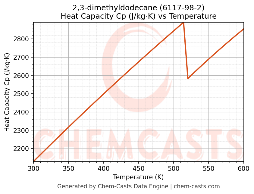 - Specific heat capacity (Cp) indicates the amount of energy required to raise the temperature of 2,3-dimethyldodecane and is critical for energy balance and heat-exchanger design.