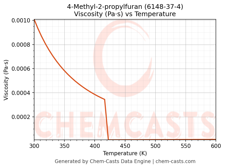 This page presents the temperature-dependent thermodynamic and transport properties of 4-Methyl-2-propylfuran (CAS 6148-37-4) calculated at a constant pressure of 1 atm (101325 Pa) over the temperature range 250-500 K.