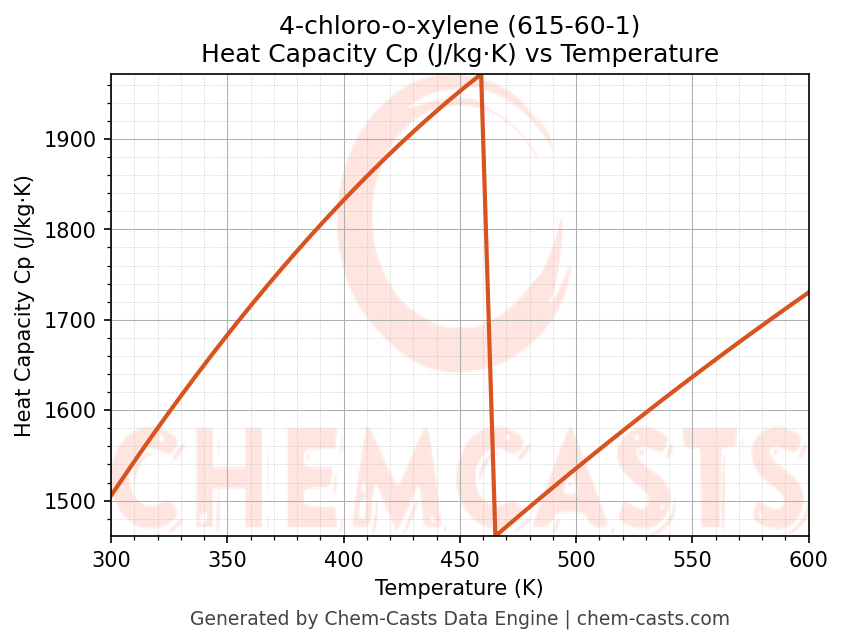 - Specific heat capacity (Cp) indicates the amount of energy required to raise the temperature of 4-chloro-o-xylene and is critical for energy balance and heat-exchanger design.