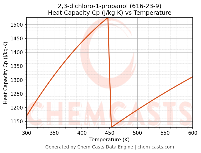 - Specific heat capacity (Cp) indicates the amount of energy required to raise the temperature of 2,3-dichloro-1-propanol and is critical for energy balance and heat-exchanger design.