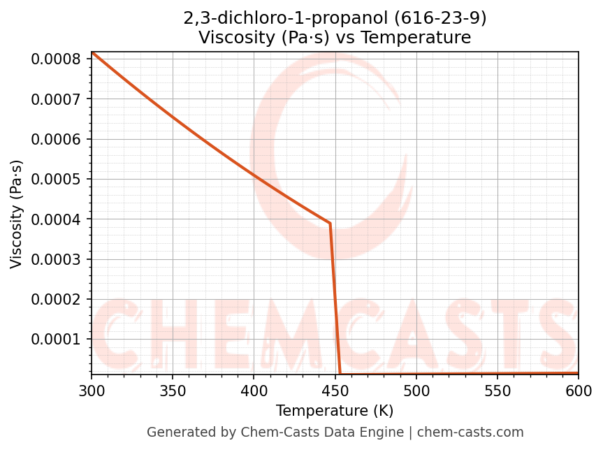 This page presents the temperature-dependent thermodynamic and transport properties of 2,3-dichloro-1-propanol (CAS 616-23-9) calculated at a constant pressure of 1 atm (101325 Pa) over the temperature range 250-500 K.