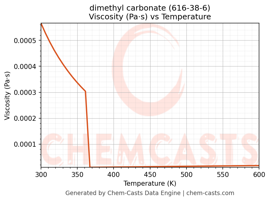 This page presents the temperature-dependent thermodynamic and transport properties of dimethyl carbonate (CAS 616-38-6) calculated at a constant pressure of 1 atm (101325 Pa) over the temperature range 250-500 K.
