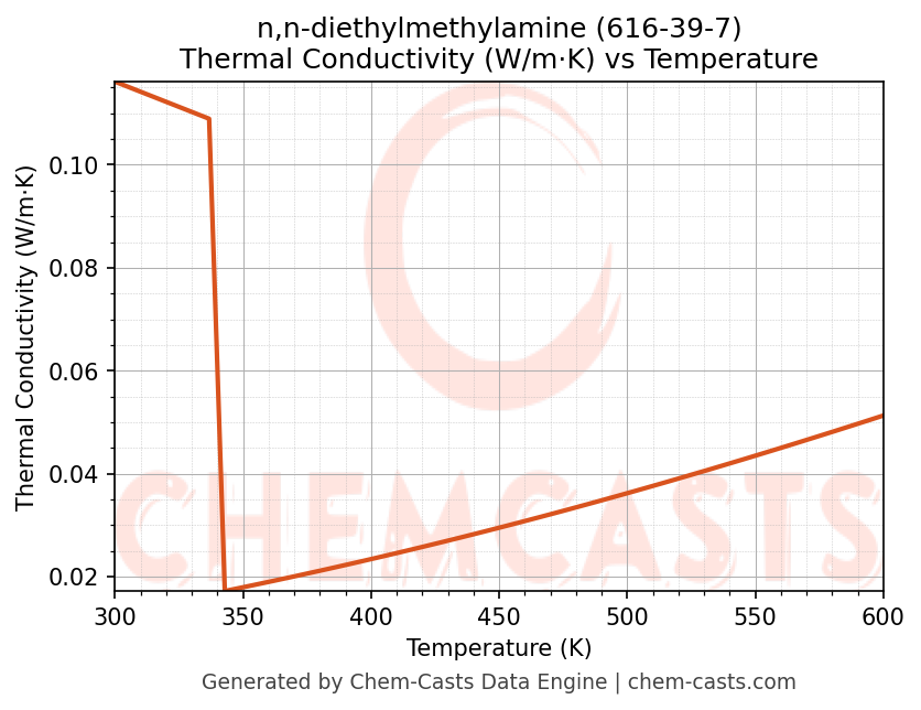 This page presents the temperature-dependent thermodynamic and transport properties of n,n-diethylmethylamine (CAS 616-39-7) calculated at a constant pressure of 1 atm (101325 Pa) over the temperature range 250-500 K.