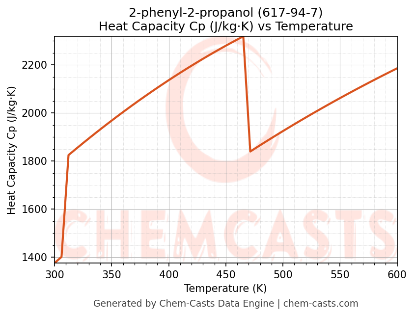 - Specific heat capacity (Cp) indicates the amount of energy required to raise the temperature of 2-phenyl-2-propanol and is critical for energy balance and heat-exchanger design.