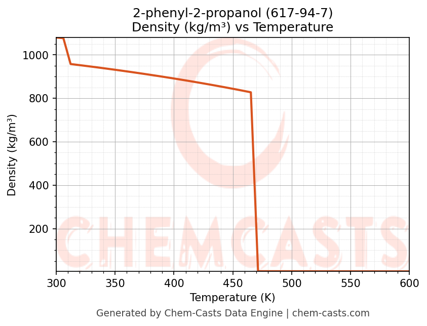 This page presents the temperature-dependent thermodynamic and transport properties of 2-phenyl-2-propanol (CAS 617-94-7) calculated at a constant pressure of 1 atm (101325 Pa) over the temperature range 250-500 K.