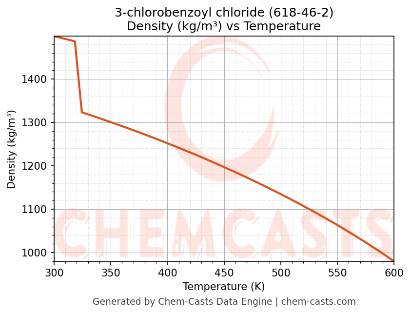 This page presents the temperature-dependent thermodynamic and transport properties of 3-chlorobenzoyl chloride (CAS 618-46-2) calculated at a constant pressure of 1 atm (101325 Pa) over the temperature range 250-500 K.