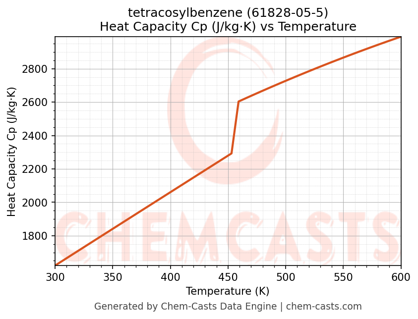 - Specific heat capacity (Cp) indicates the amount of energy required to raise the temperature of tetracosylbenzene and is critical for energy balance and heat-exchanger design.