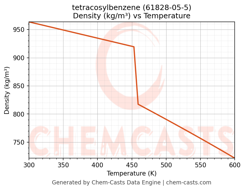 This page presents the temperature-dependent thermodynamic and transport properties of tetracosylbenzene (CAS 61828-05-5) calculated at a constant pressure of 1 atm (101325 Pa) over the temperature range 250-500 K.