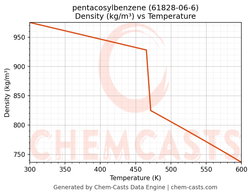 This page presents the temperature-dependent thermodynamic and transport properties of pentacosylbenzene (CAS 61828-06-6) calculated at a constant pressure of 1 atm (101325 Pa) over the temperature range 250-500 K.