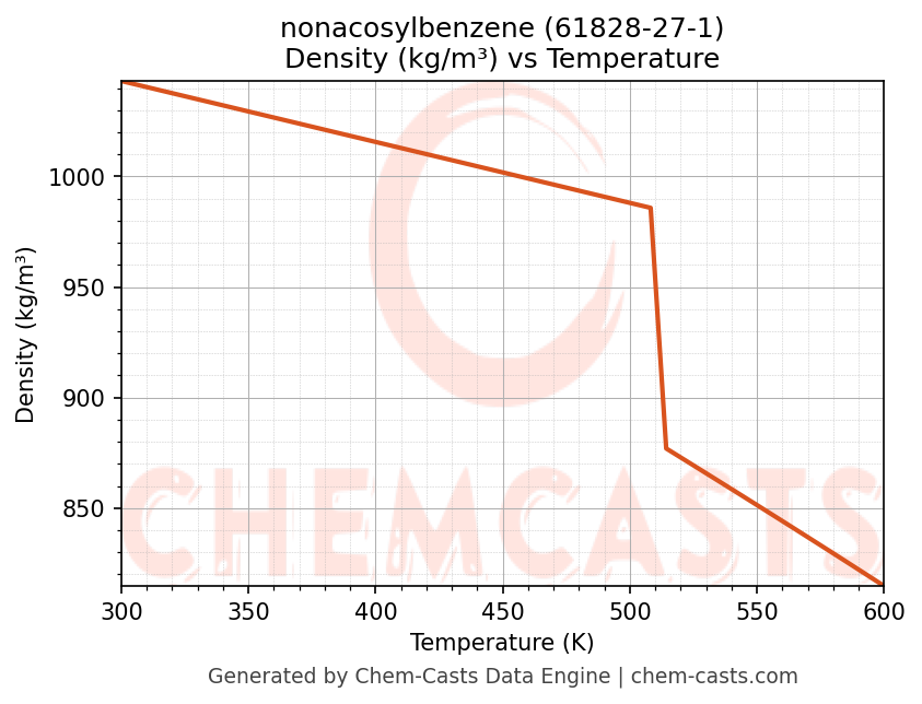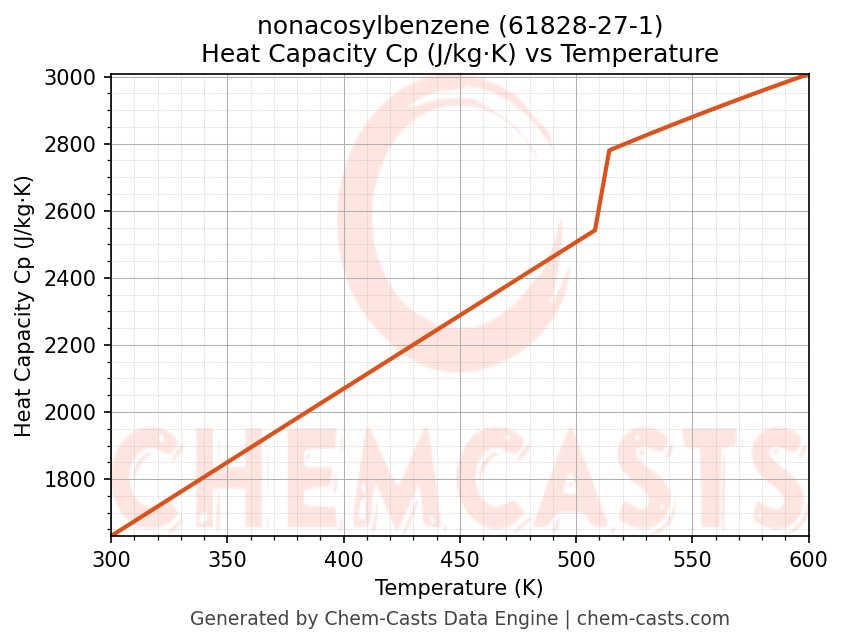 - Specific heat capacity (Cp) indicates the amount of energy required to raise the temperature of nonacosylbenzene and is critical for energy balance and heat-exchanger design.