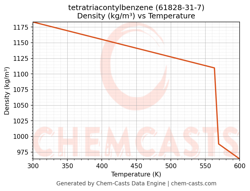 This page presents the temperature-dependent thermodynamic and transport properties of tetratriacontylbenzene (CAS 61828-31-7) calculated at a constant pressure of 1 atm (101325 Pa) over the temperature range 250-500 K.