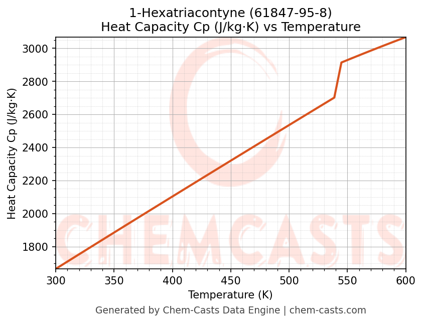 - Specific heat capacity (Cp) indicates the amount of energy required to raise the temperature of 1-Hexatriacontyne and is critical for energy balance and heat-exchanger design.