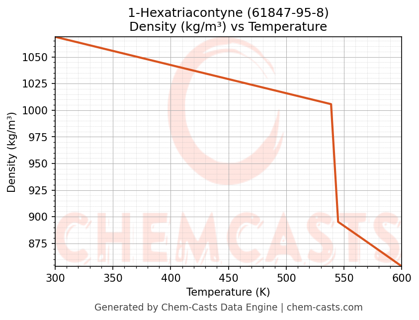 This page presents the temperature-dependent thermodynamic and transport properties of 1-Hexatriacontyne (CAS 61847-95-8) calculated at a constant pressure of 1 atm (101325 Pa) over the temperature range 250-500 K.