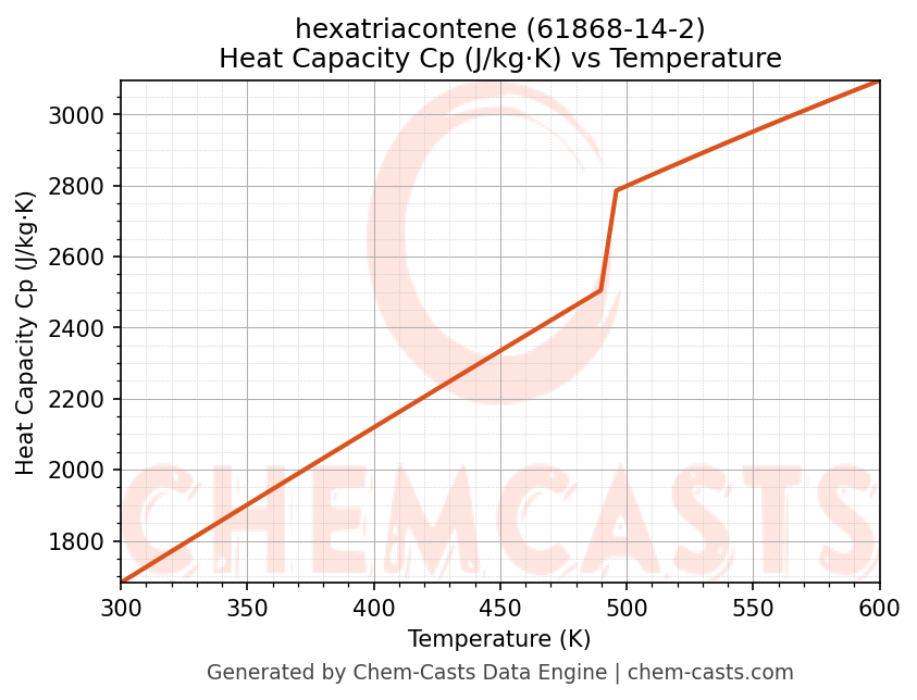 - Specific heat capacity (Cp) indicates the amount of energy required to raise the temperature of hexatriacontene and is critical for energy balance and heat-exchanger design.