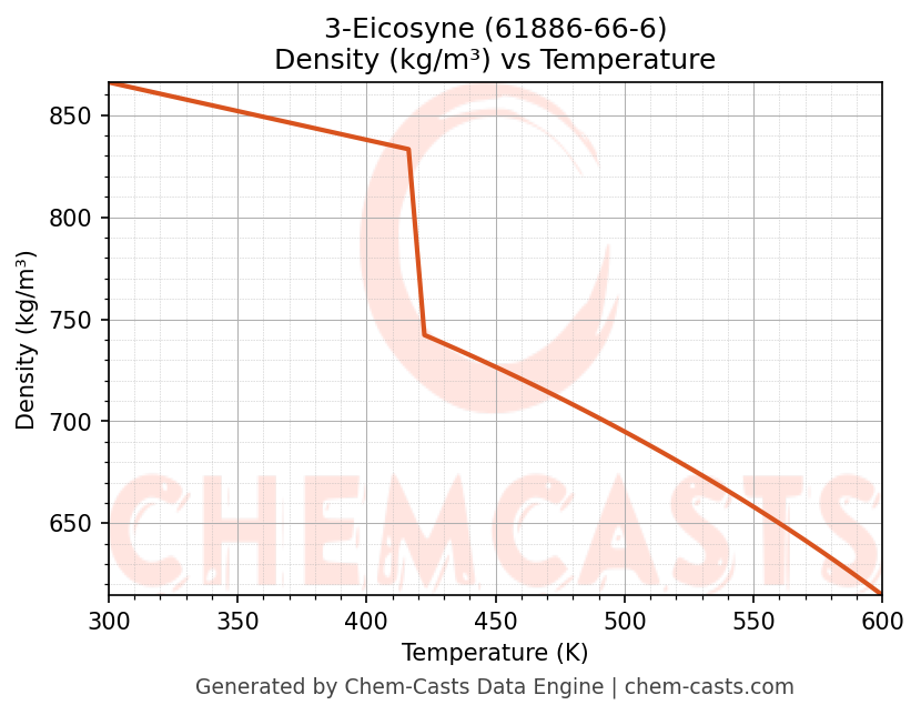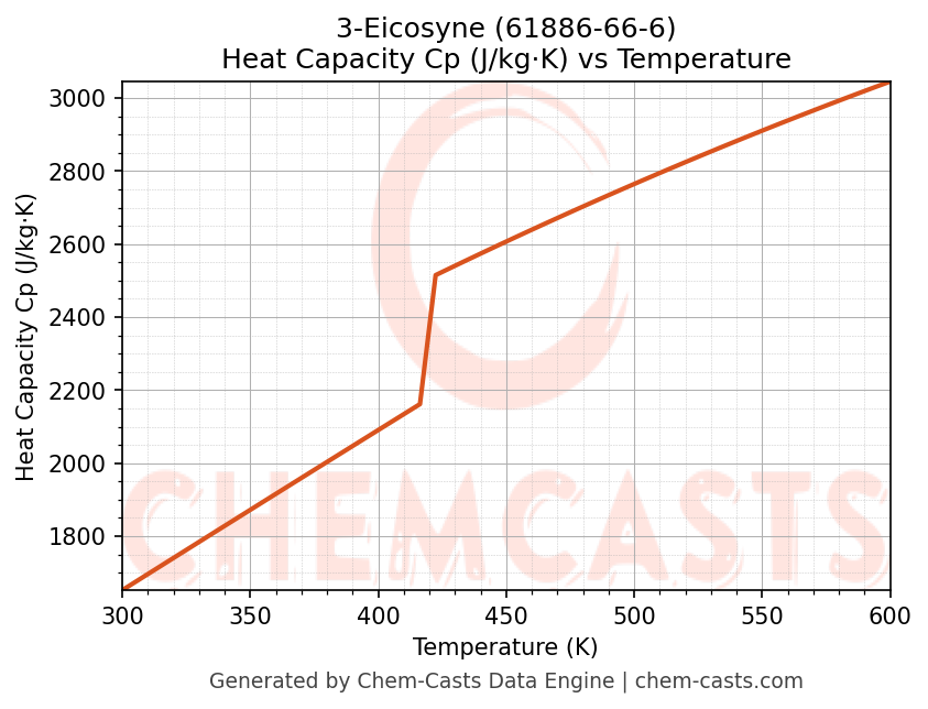 - Specific heat capacity (Cp) indicates the amount of energy required to raise the temperature of 3-Eicosyne and is critical for energy balance and heat-exchanger design.