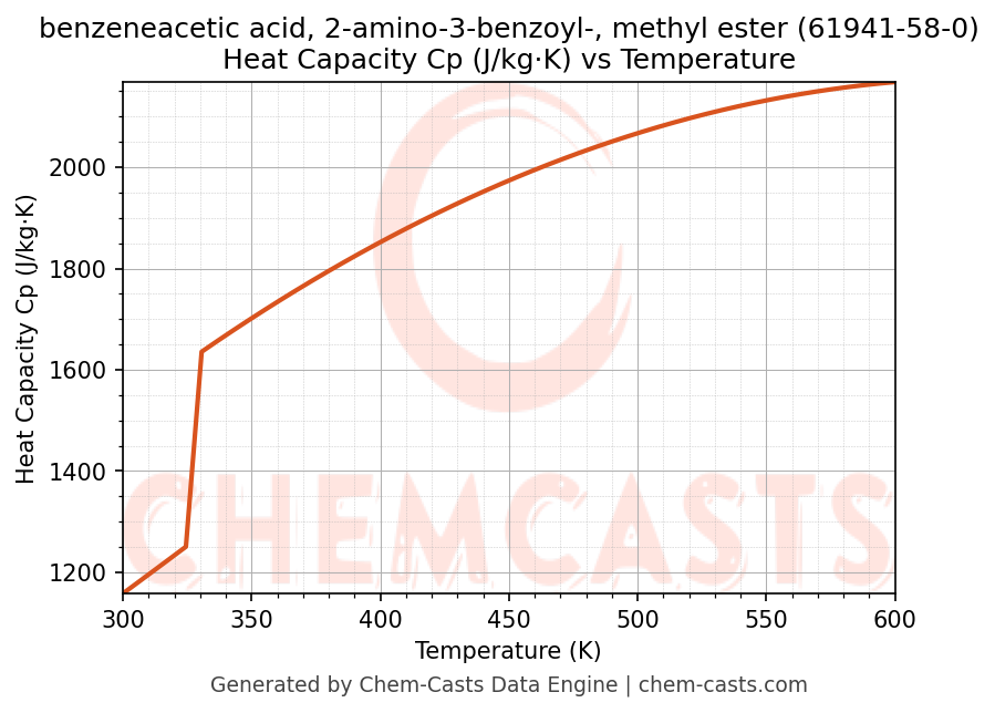 - Specific heat capacity (Cp) indicates the amount of energy required to raise the temperature of benzeneacetic acid, 2-amino-3-benzoyl-, methyl ester and is critical for energy balance and heat-exchanger design.