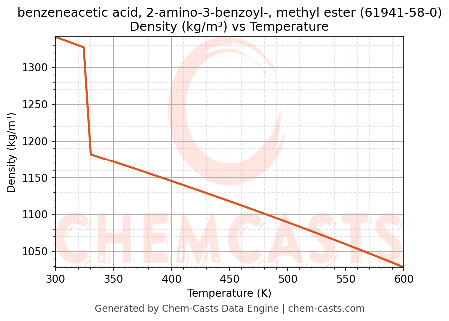 This page presents the temperature-dependent thermodynamic and transport properties of benzeneacetic acid, 2-amino-3-benzoyl-, methyl ester (CAS 61941-58-0) calculated at a constant pressure of 1 atm (101325 Pa) over the temperature range 250-500 K.