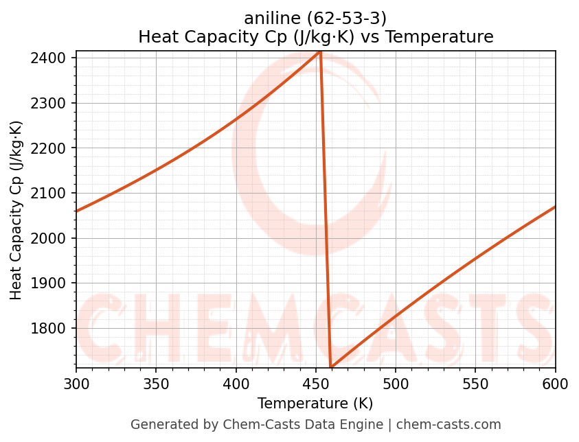 - Specific heat capacity (Cp) indicates the amount of energy required to raise the temperature of aniline and is critical for energy balance and heat-exchanger design.